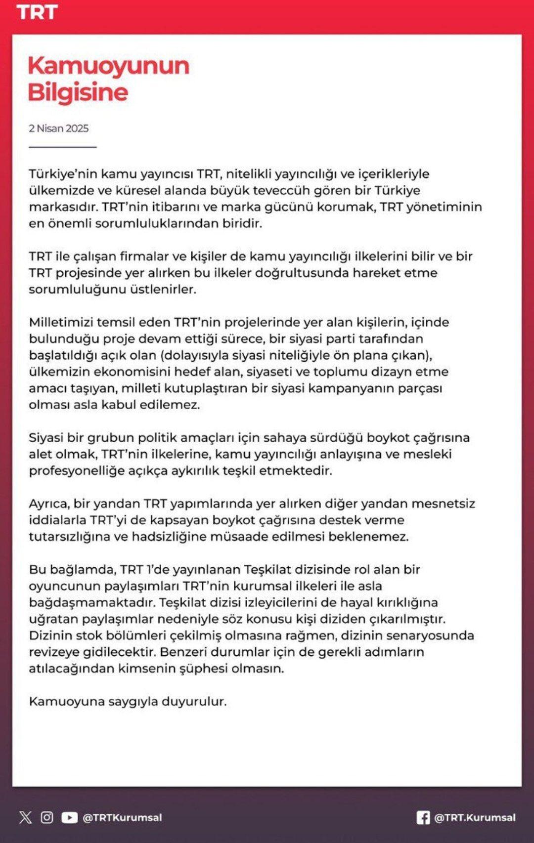 Ayrıca, kurum, "TRT ile çalışan tüm firmalar ve sanatçılar, kamu yayıncılığı sorumluluğunu ve tarafsızlık ilkesini benimser. Bu bağlamda, bir siyasi kampanyanın parçası haline gelmek ve mesnetsiz boykot çağrılarına destek vermek, hem kurumumuzun hem de ülkemizin değerlerine aykırıdır," dedi.