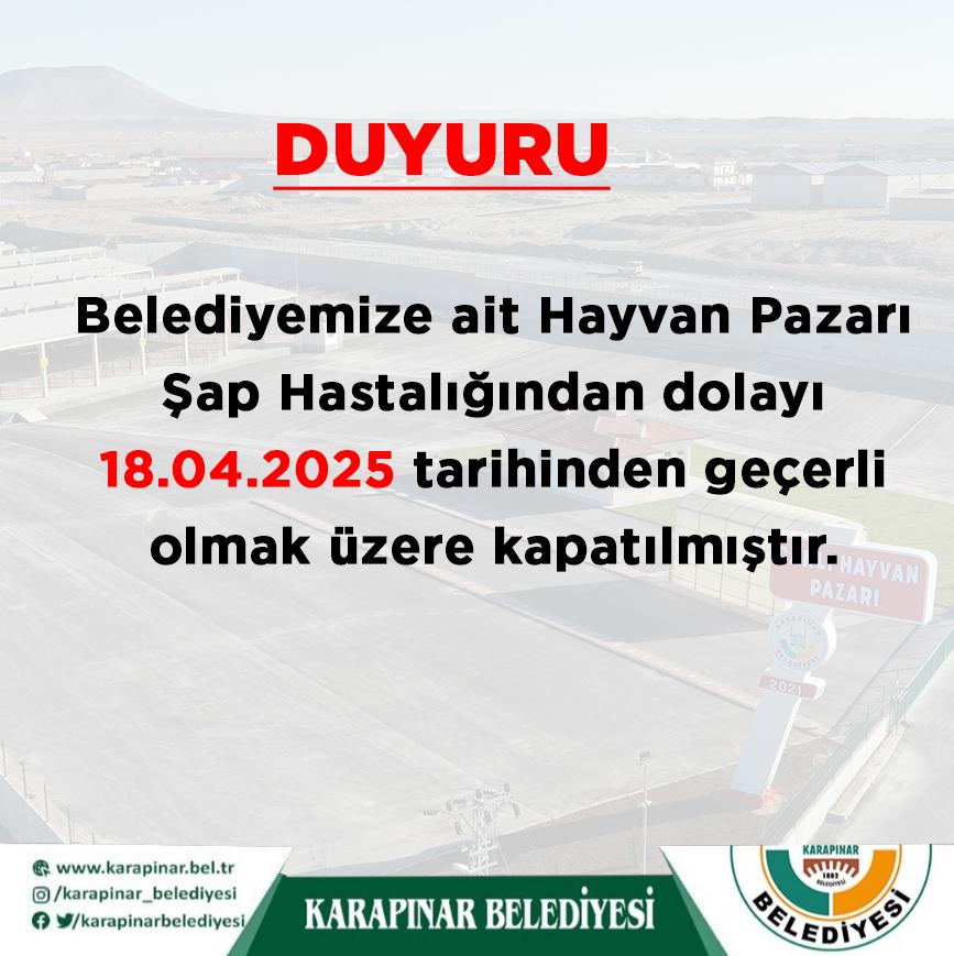 Belediyeden yapılan duyuruda, "Belediyemize ait Hayvan Pazarı, şap hastalığı nedeniyle 18.04.2025 tarihinden geçerli olmak üzere ikinci bir duyuruya kadar kapatılmıştır” ifadeleri kullanıldı.