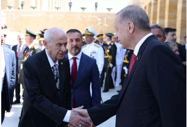 Erdoğan, Atatürk'ün mozolesine ay yıldız motifli çelengi bıraktı. Saygı duruşunun ardından İstiklal Marşı okundu.