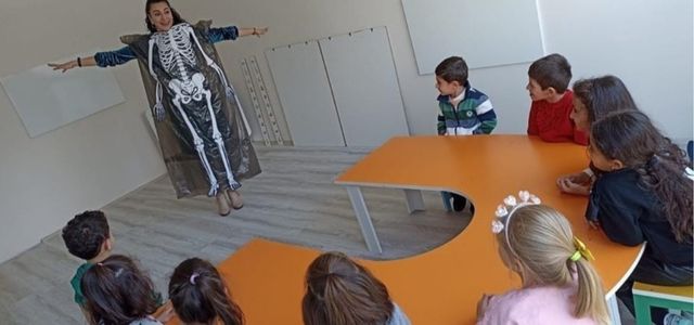 Öğrenmeye meraklı minikler öğretmenlerini ilgi ile dinledi ve iskelet denemesinde de mutlulukları gözlerinden okunuyordu.