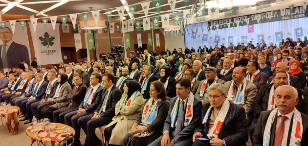 Kongrede konuşan Gelecek Partisi Genel Başkanı Ahmet Davutoğlu ise, partinin kurluşunda yaşadıkları sorunlara değindi. 4 yıl içerisinde çetin engellerle karşılaştıklarını kaydeden Davutoğlu, Konya'nın kendisi için her zaman sığınak olduğunu kaydetti. Davutoğlu, "Partimizin kuruluşunun üzerinden 4 yıl geçti. Bu 4 yılda çetin engellerle karşılaştık. Ama başımız Toroslar kadar dikti ve hiçbir şeyden yılmadık. Yüreğimiz Konya Ovası kadar engindi ve hiç kimseye kin beslemedik. Millet ve devlet çıkarı dışında hiçbir zaman şahsi çıkarımızı öne çıkarmadık. Konya bütün bu mücadelemde en temel sığınağım oldu” dedi.