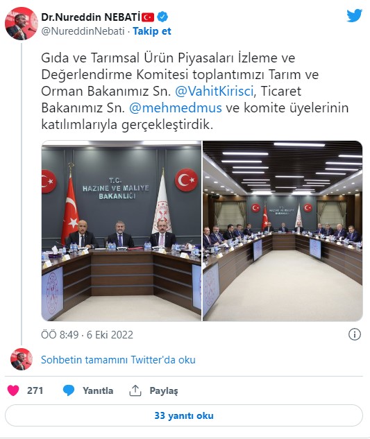 Gıda ve Tarımsal Ürün Piyasaları İzleme ve Değerlendirme Komitesi (Komite) Hazine ve Maliye Bakanı Sayın Dr. Nureddin NEBATİ'nin ev sahipliğinde; Tarım ve Orman Bakanı Sayın Prof. Dr. Vahit KİRİŞCİ, Ticaret Bakanı Sayın Mehmet MUŞ, Cumhurbaşkanlığı Strateji ve Bütçe Başkanı Sayın İbrahim ŞENEL ve Türkiye Cumhuriyet Merkez Bankası Başkanı Sayın Prof. Dr. Şahap KAVCIOĞLU'nun katılımıyla toplanmıştır.