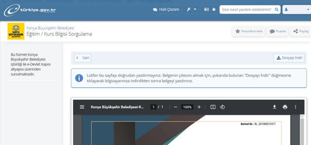 Katılım belgesini dijital ortamda almak ya da sorgulamak isteyen kursiyerler, 4 adımda belgelerine ulaşabiliyor. İlk adımda, www.turkiye.gov.tr adresine kimlik bilgileri ile giriş yapılıyor. İkinci adımda arama bölümüne "eğitim kurs bilgisi sorgulama” yazarak çıkan ekrandan "Konya Büyükşehir Belediyesi / Eğitim / Kurs Bilgisi Sorgulama” menüsüne tıklanıyor. Üçüncü adımda KOMEK bünyesinde verilen eğitimlerden 2020 yılı ve sonrasında başarı ile tamamlanan tüm branşlar listeleniyor. Dördüncü ve son adımda ise ekranda listelenen branşın karşısındaki "görüntüle” butonu ile katılım belgesinin son haline dijital olarak ulaşılabiliyor.
