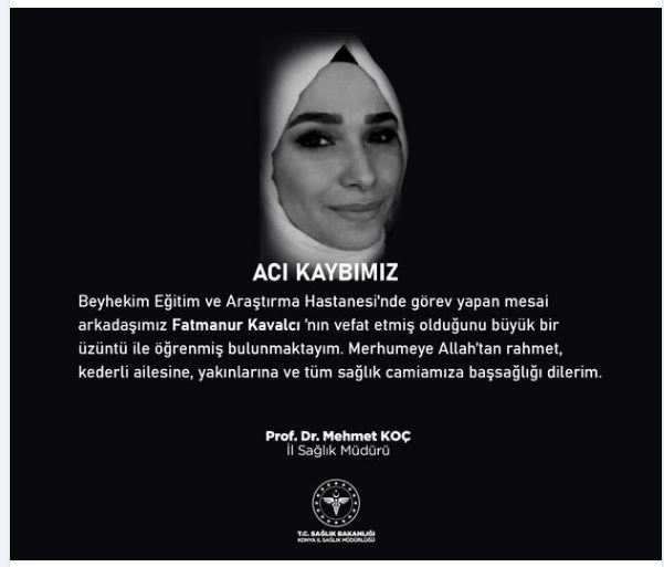 İl Sağlık Müdürü Mehmet Koç acı haberi sosyal medya hesabından şu sözlerle duyurdu: Beyhekim Eğitim ve Araştırma Hastanesi'nde görev yapan mesai arkadaşımız Fatmanur Kavalcı vefat etmiş olduğunu büyük bir üzüntü ile öğrenmiiş bulunmaktayım. Merhumeye Allah'tan rahmet, kederli ailesine, yakınlarına ve tüm sağlık camiamıza başsağlığı dilerim.''
