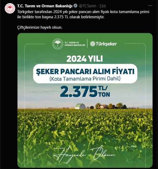 Bakanlığın sosyal medya hesabından yapılan açıklamada, bu yılın şeker pancarı alım fiyatına ilişkin bilgi verildi.
