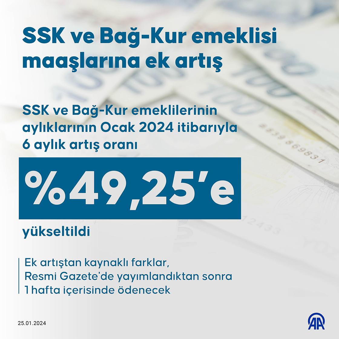 SSK ve Bağkur emekli maaşlarında ocak ödeme dönemi itibarıyla geçerli olacak 6 aylık artış oranı yüzde 49,25 olacak.