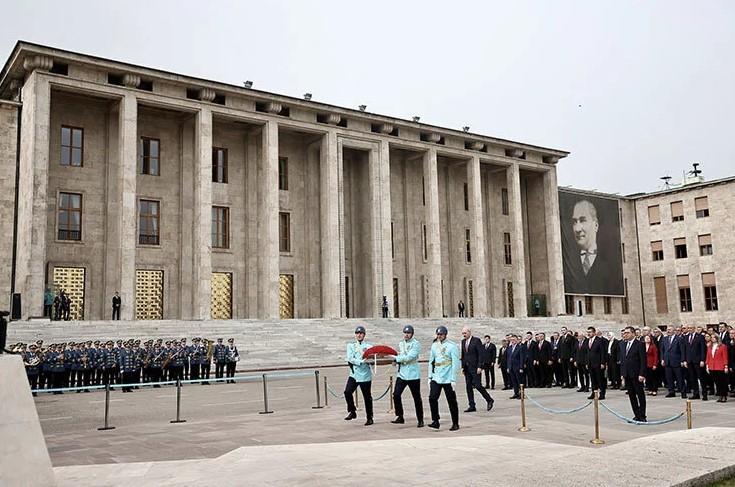 Törende, TBMM Başkanı Numan Kurtulmuş, Atatürk Anıtı'na kırmızı ve beyaz karanfillerden oluşan çelenk bırakmasının ardından saygı duruşunda bulunuldu, İstiklal Marşı okundu.