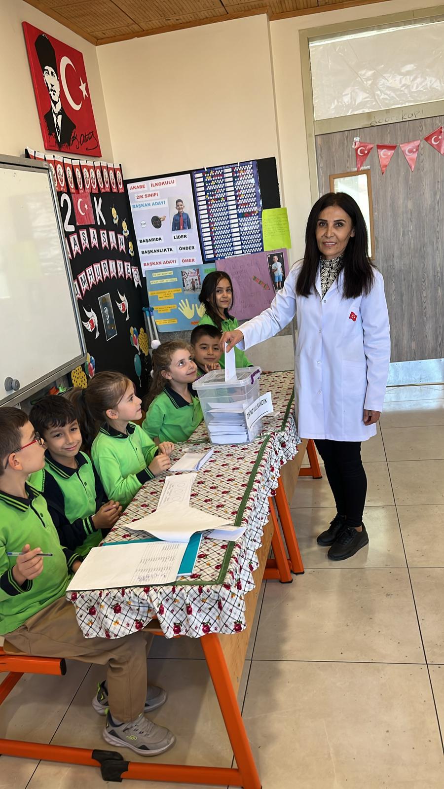 Akabe İlkokulu  2/K sınıfı öğrencileri, okul müdürü Mehmet KARABAYIR, müdür yardımcıları Kamber ATALAY, Ümmü Gülsüm ŞİMŞEK, Kamil ERDEM ve sınıf öğretmeni Şehriban ALTAŞ'ın da katılımıyla demokrasinin tüm gereklerini yerine getirerek sınıf başkanını seçti.