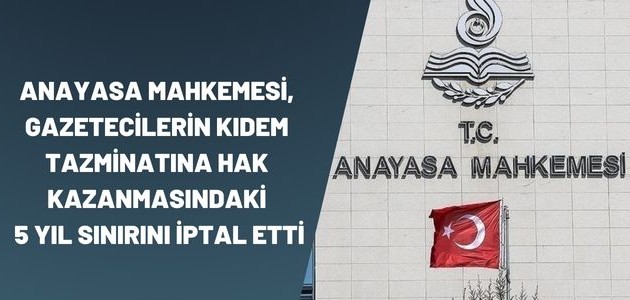 Anayasa Mahkemesi, gazetecilere kıdem tazminatı ödenmesi için "meslekte en az 5 yıl çalışmış olma şartını" düzenleyen kanun hükmünü iptal etti.