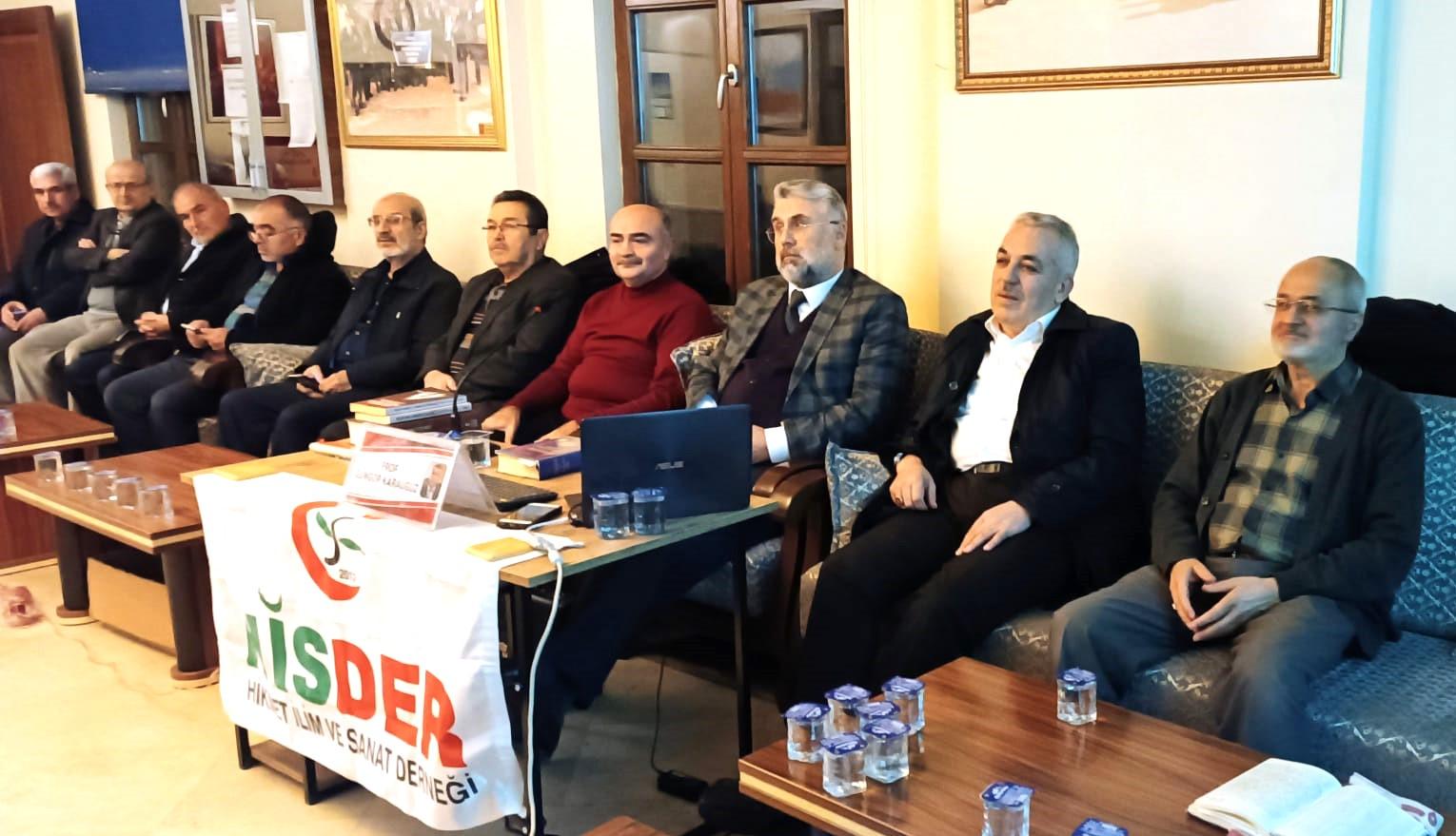 HİSDER (Hikmet İlim ve Sanat Derneği)'in Konya Muharip Gaziler Derneği binasında düzenlediği "Pazartesi Toplantıları”nda NEÜ Ahmet Keleşoğlu Eğitim Fakültesi. Türkçe ve Sosyal Bilgiler Eğitimi Anabilim Dalı Öğretim Üyesi Prof.Dr. Güngör KARAUĞUZ "Hz. İbrahim ve Arz-ı Mevud” hakkında slayt eşliğinde dernek üyelerine bilgi verdi.