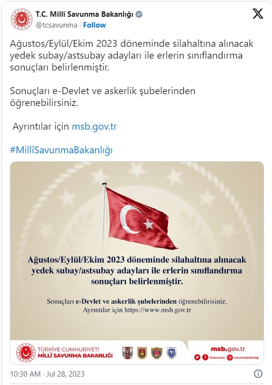 Askerlik yerlerine yönelik MSB'den "Ağustos/Eylül/Ekim 2023 döneminde silahaltına alınacak yedek subay/astsubay adayları ile erlerin sınıflandırma sonuçları belirlenmiştir" açıklaması yapıldı.