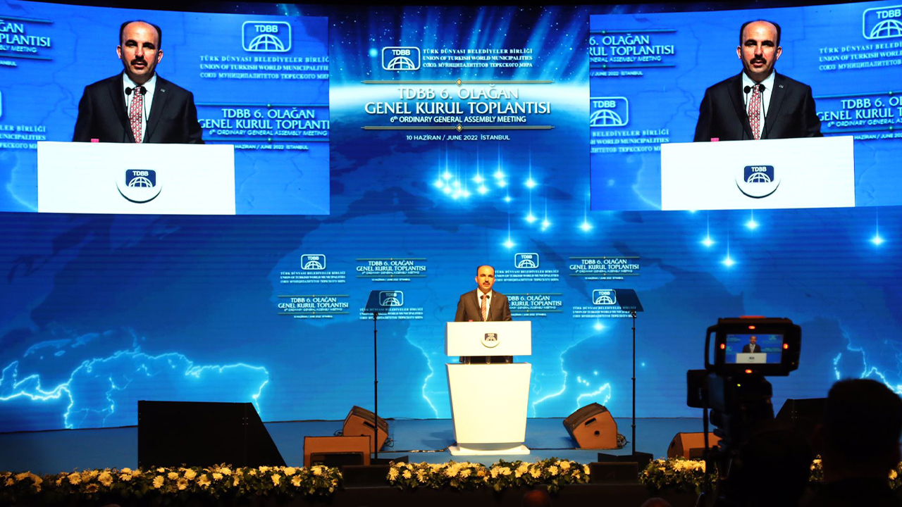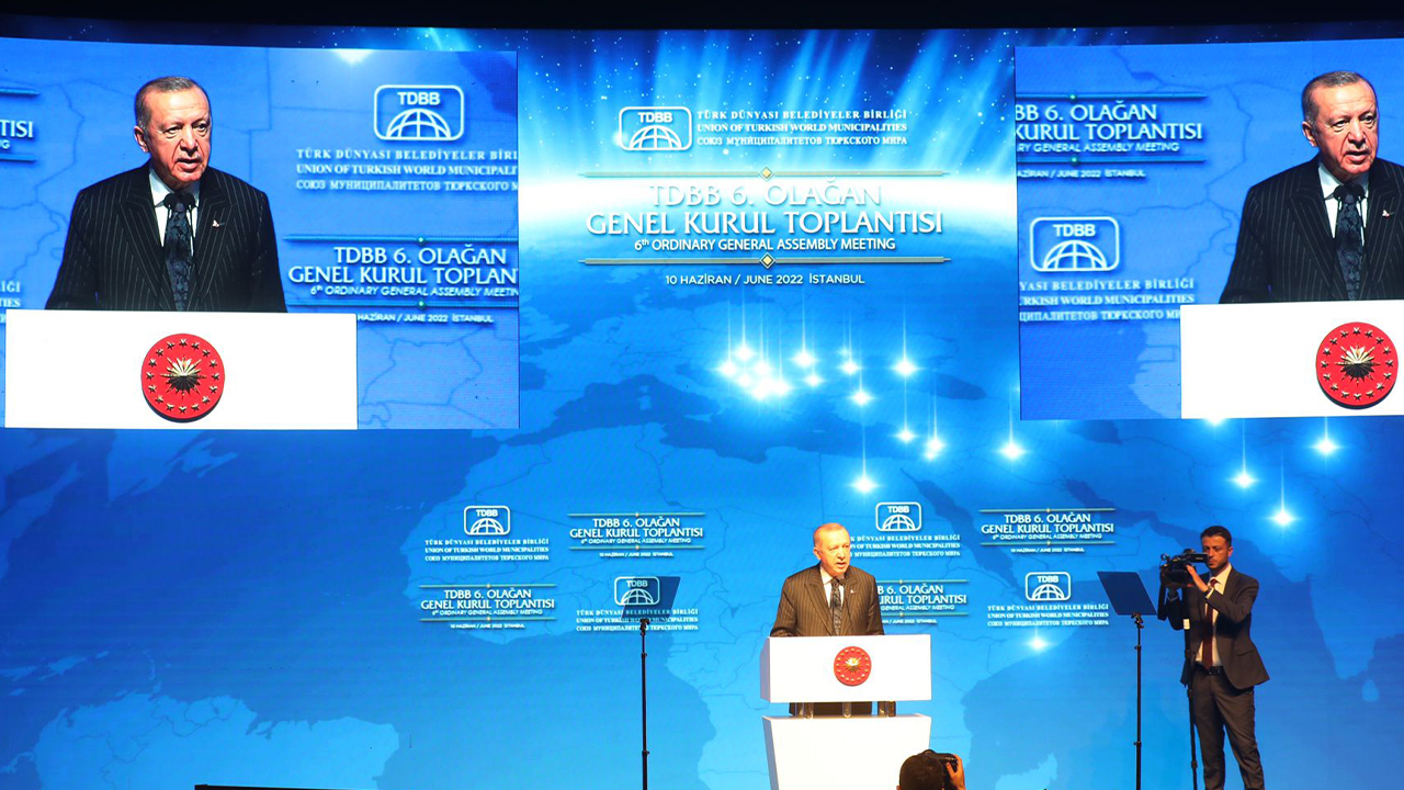 Giderek etkisi artan küresel siyasi ve ekonomik krizlerin bu tür iş birliklerini daha kıymetli hale getirdiğini dikkat çeken Cumhurbaşkanı Erdoğan, "Türk Devletleri Teşkilatı ile Türk Dünyası Belediyeler Birliği nezdinde somutlaşan iş birliğimiz; coğrafi, demokratik, ekonomik ve elbette siyasi kapasite olarak hepimize eşsiz fırsatlar sunuyor. Atalarımız bir elin nesi var, iki elin sesi var' diyor. Bu anlayıştan hareketle teşkilatımızın ve birliğimizin kapsamını, etkisini, derinliğini artırmak için çok daha fazla çalışmalıyız. Yeniden yapılanan küresel yönetim sistemi için ülkelerimizin hak ettiği yeri almasını ancak bu şekilde temin edebiliriz. Bunun için birliğimizin bilgi ve tecrübe paylaşımı, eğitim, kurumsal iletişim, kardeş şehirler, sosyal ve kültürel etkinlikler, çalışma ziyaretleri ve yayınlarla ortaya koyduğu faaliyetleri artırarak sürdürmeliyiz. Coğrafyamızın genişliği bu çalışmalar için engel değil, tam tersine eşsiz bir zenginliktir. Günümüzde İpek Yolu gibi kadim ticaret yolları dahi yeni karayolu ve demir yolu hatları inşa edilerek tekrar canlandırılmaya çalışılıyor.” diye konuştu.
