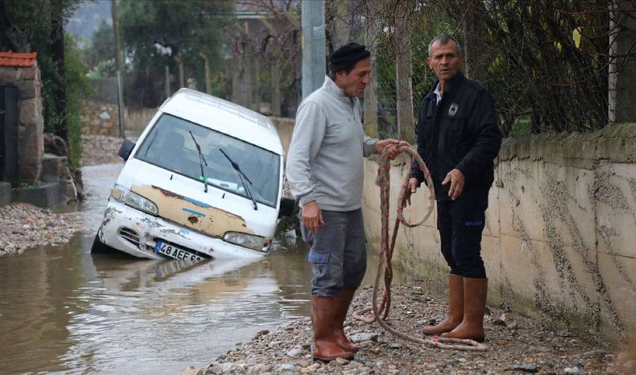 Sağanak nedeniyle Bitez Mahallesi'ndeki Söğütlü Deresi'nin su seviyesi yükseldi.Dere yatağında mahsur kalan park halindeki 2 araç ise Bodrum Belediyesi ekiplerince kepçe yardımıyla çıkarıldı.