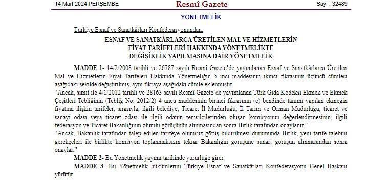 Ekmek ve simit fiyatı ilgili belediye, Ticaret İl Müdürlüğü, İl Tarım ve Orman Müdürlüğü, ticaret ve sanayi odası veya ticaret odası ile ilgili odanın temsilcilerinden oluşan komisyon tarafından değerlendirilecek. Ticaret Bakanlığının olumlu görüşünün alınmasından sonra Birlik tarafından onaylanacak.