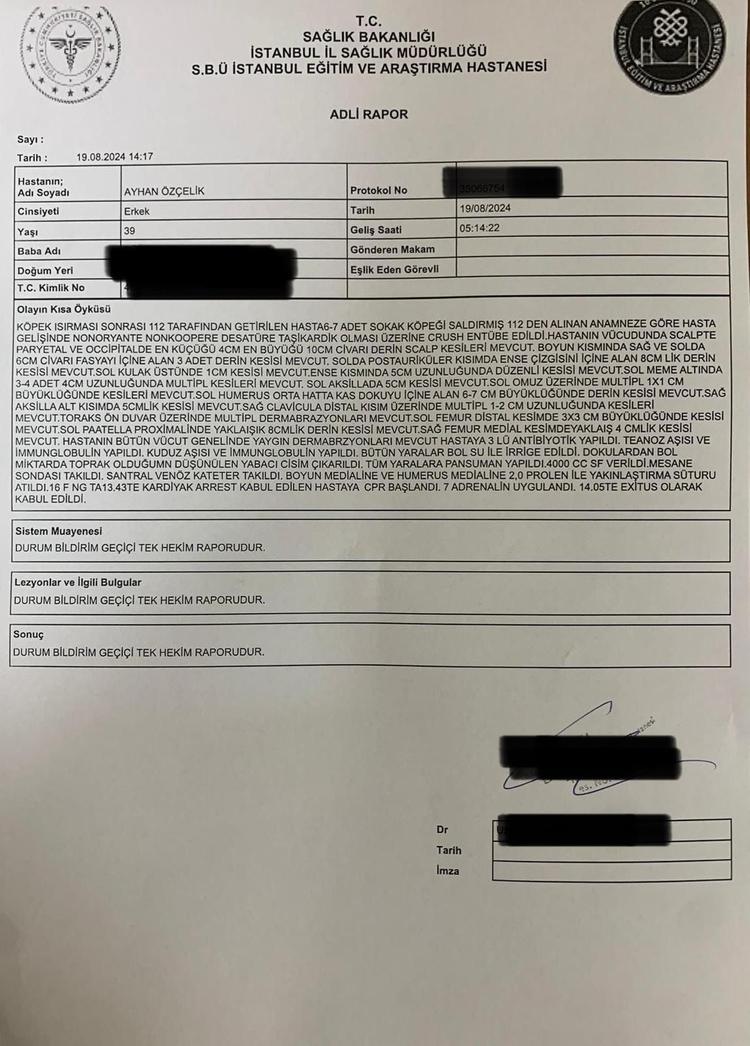 Özçelik'in yaralı olarak götürüldüğü İstanbul Eğitim ve Araştırma Hastanesi'nde hazırlanan adli raporda, köpek ısırması sonrası sağlık ekiplerince hastaneye getirildiği ve kendisine 6-7 sokak köpeğinin saldırdığı belirtildi.