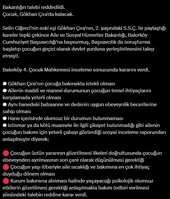 Gökhan Çıra'nın kızıyla paylaştığı fotoğrafın ardından başlatılan soruşturma hızla sonuçlandı. Yapılan inceleme sonucunda, aile içinde herhangi bir olumsuz durumun olmadığı belirlenerek, çocuğun Gökhan Çıra'nın yanında kalmasına karar verildi.