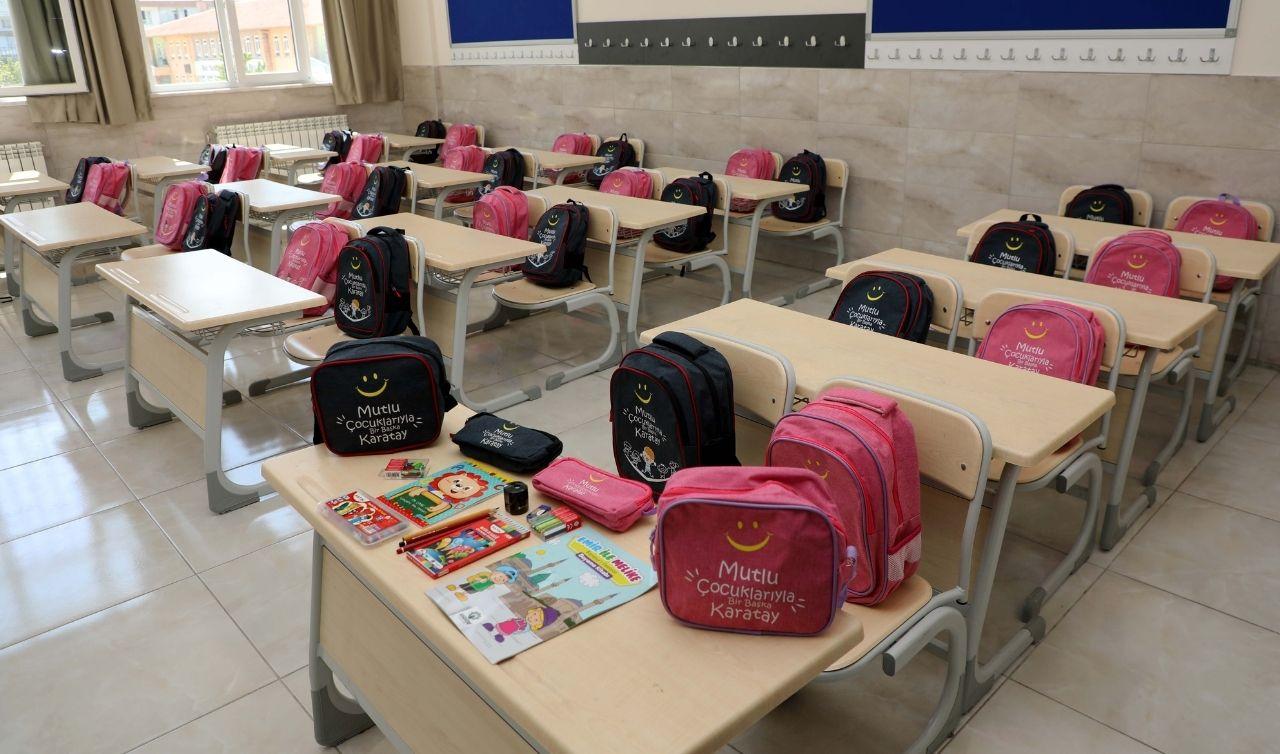 Bu kapsamda ilkokul 1'inci sınıfa başlayacak her öğrenci için okul çantasının yanı sıra kalem seti, kalemlik, silgi, kalemtıraş, beslenme çantası, kuru ve pastel boya setleri, güzel yazı defteri, boyama kitabı ile sayı çubukları ve fasulyelerden oluşan kırtasiye seti hazırlandı. Çantalar ve kırtasiye setleri, öğrencilerin sıralarındaki yerini almaya başladı.
