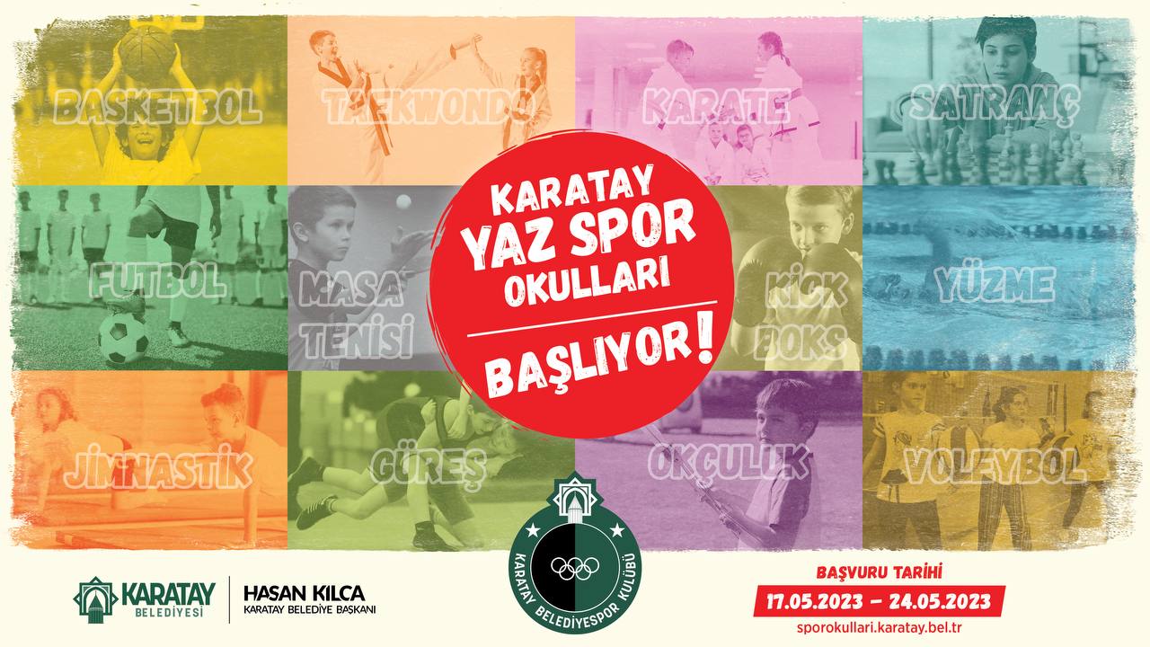 Karatay Yaz Spor Okulları'na katılacak çocuklar gün boyu farklı aktivitelerle verimli bir dönem geçirecek. Karatay Belediyesi Gençlik ve Spor Hizmetleri Müdürlüğü koordinasyonunda yapılacak olan Karatay Yaz Spor Okulu'nda Futbol, Masa Tenisi, Basketbol, Taekwondo, Kickboks, Karate, Jimnastik, Voleybol, Güreş, Yüzme, Okçuluk ve Satranç olmak üzere toplamda 12 branşta eğitimler verilecek.