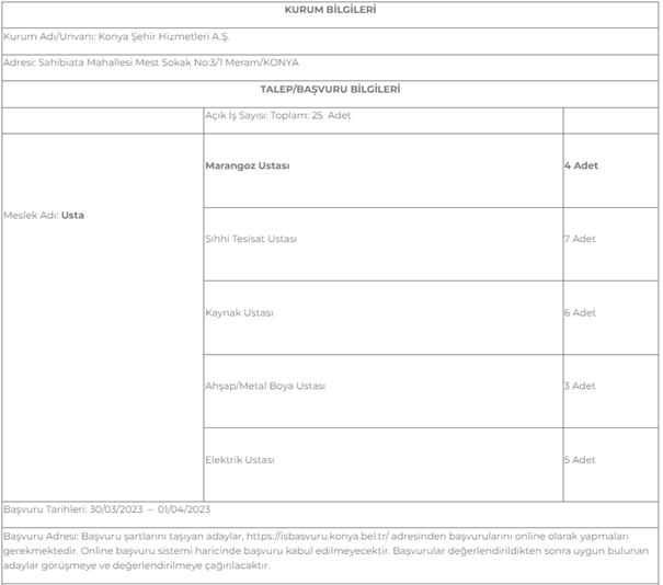 Başvuru şartlarını taşıyan adaylar, https://isbasvuru.konya.bel.tr/ adresinden başvurularını online olarak yapmaları gerekmektedir. Online başvuru sistemi haricinde başvuru kabul edilmeyecektir. Başvurular değerlendirildikten sonra uygun bulunan adaylar görüşmeye ve değerlendirilmeye çağırılacaktır.