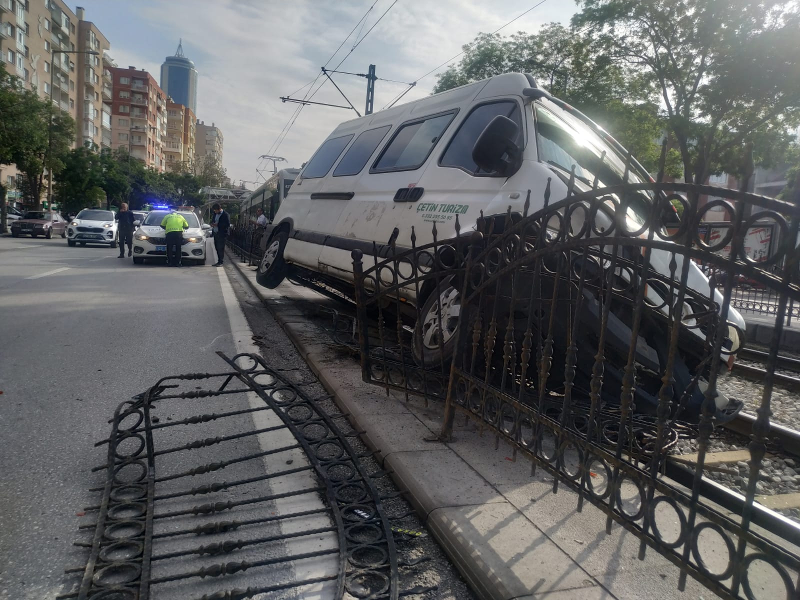 Musa Y. idaresindeki 42 C 0382 plakalı işçi servis aracı, sürücünün direksiyon hakimiyetini kaybetmesi sonucu korkulukları aşıp tramvay yoluna girdi.
