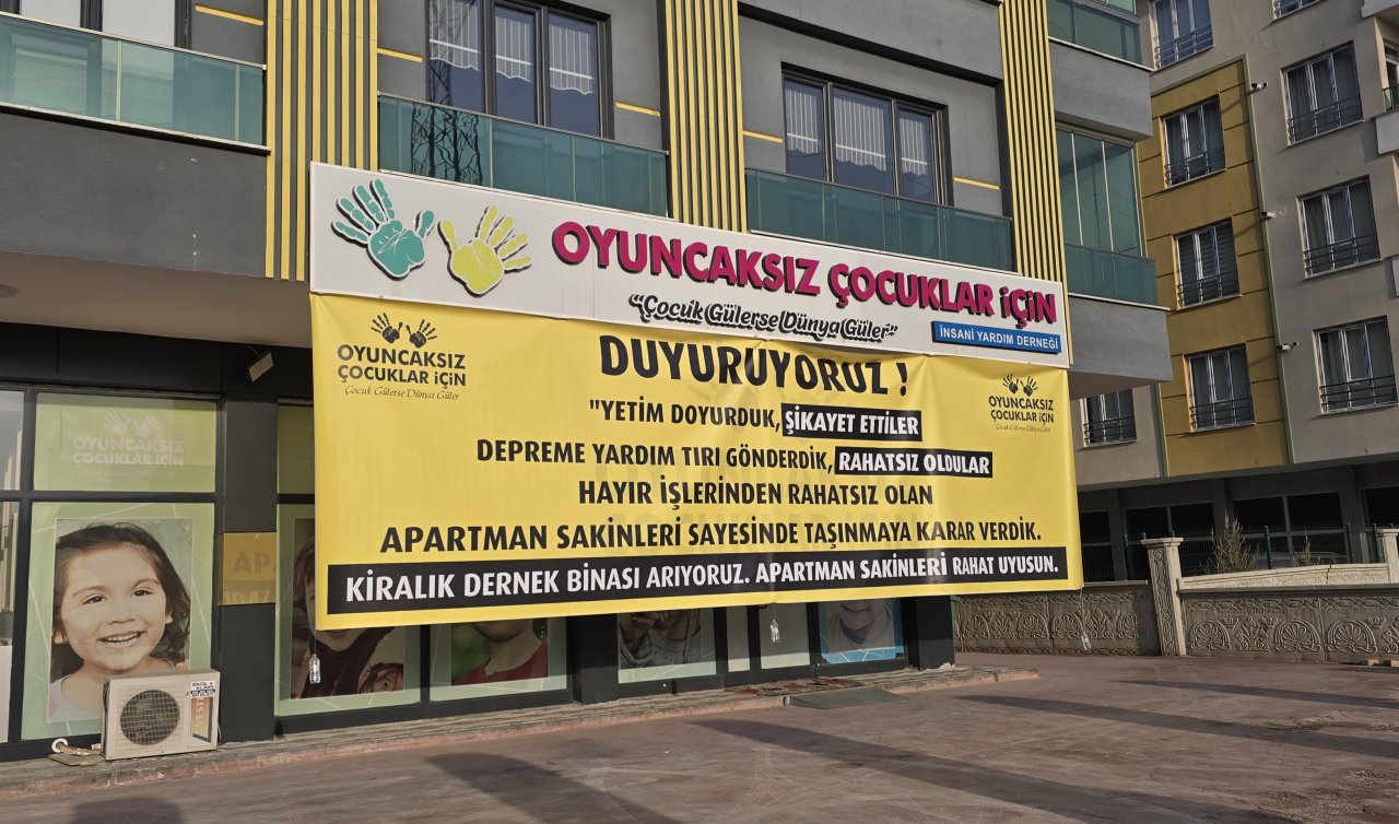 "Yetim doyurduk, şikayet ettiler. Depreme yardım tırı gönderdik, rahatsız oldular. Hayır işlerinden rahatsız olan apartman sakinleri sayesinde taşınmaya karar verdik. Kiralık dernek binası arıyoruz. Apartman sakinleri rahat uyusun."