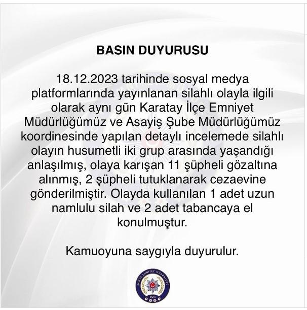 Doğuş Mahallesi'nde gerçekleşen olaylarda bir iş yerinin kurşunlandığı ve kavganın husumetli iki grup arasında yaşandığı anlaşıldı. Volkan D. Ve Mehmet T. Tutuklandı. Karatay İlçe Emniyet Müdürlüğü ve Asayiş Şube Müdürlüğü ekiplerinin koordineli bir şekilde yürüttüğü çalışmalarda olaya karışan 11 şüpheli, iki adet tabanca ve bir adet uzun namlulu silahla birlikte yakalandı.