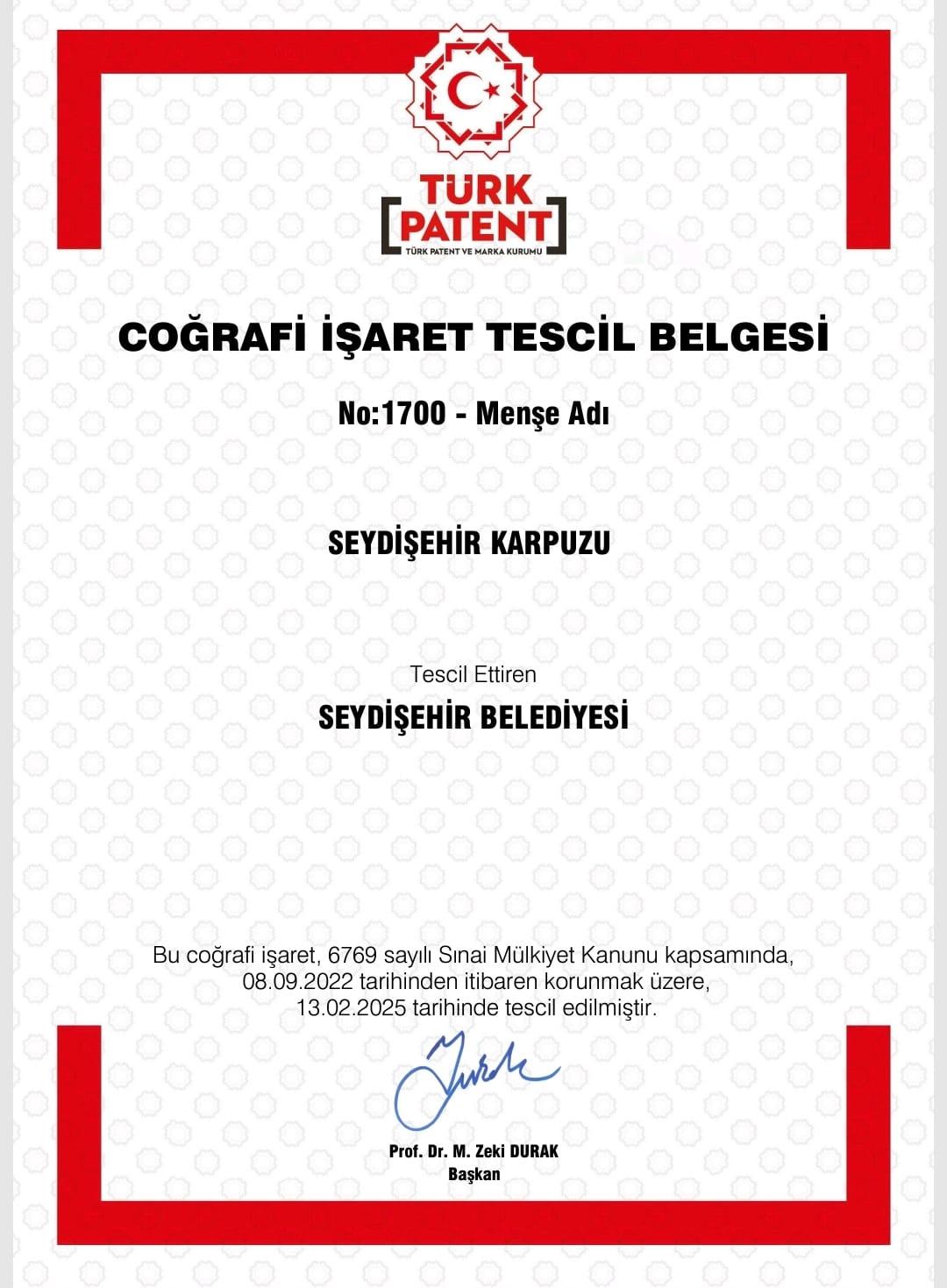 Seydişehir Karpuzunun Coğrafi İşaret Tescil Belgesini Türk Patent ve Marka Kurumu Başkanlığı tarafından tescillendiğini kaydeden Belediye Başkanı Hasan Ustaoğlu; "Seydişehir'in sahip olduğu değerlerin tanıtımını sağlamak ve markalaştırmak hedefiyle çalışmalarımızı aralıksız sürdürüyoruz" ifadesini kullandı.