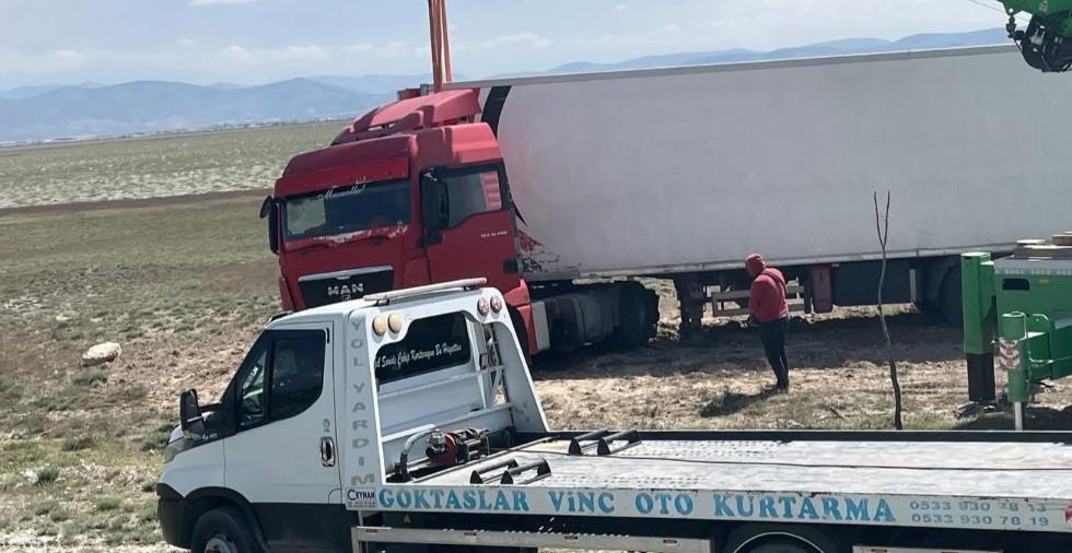 Şarampole düşen tırın bulunduğu yerden kaldırılması için çekici ve vinç yardımıyla çalışma başlatıldı.