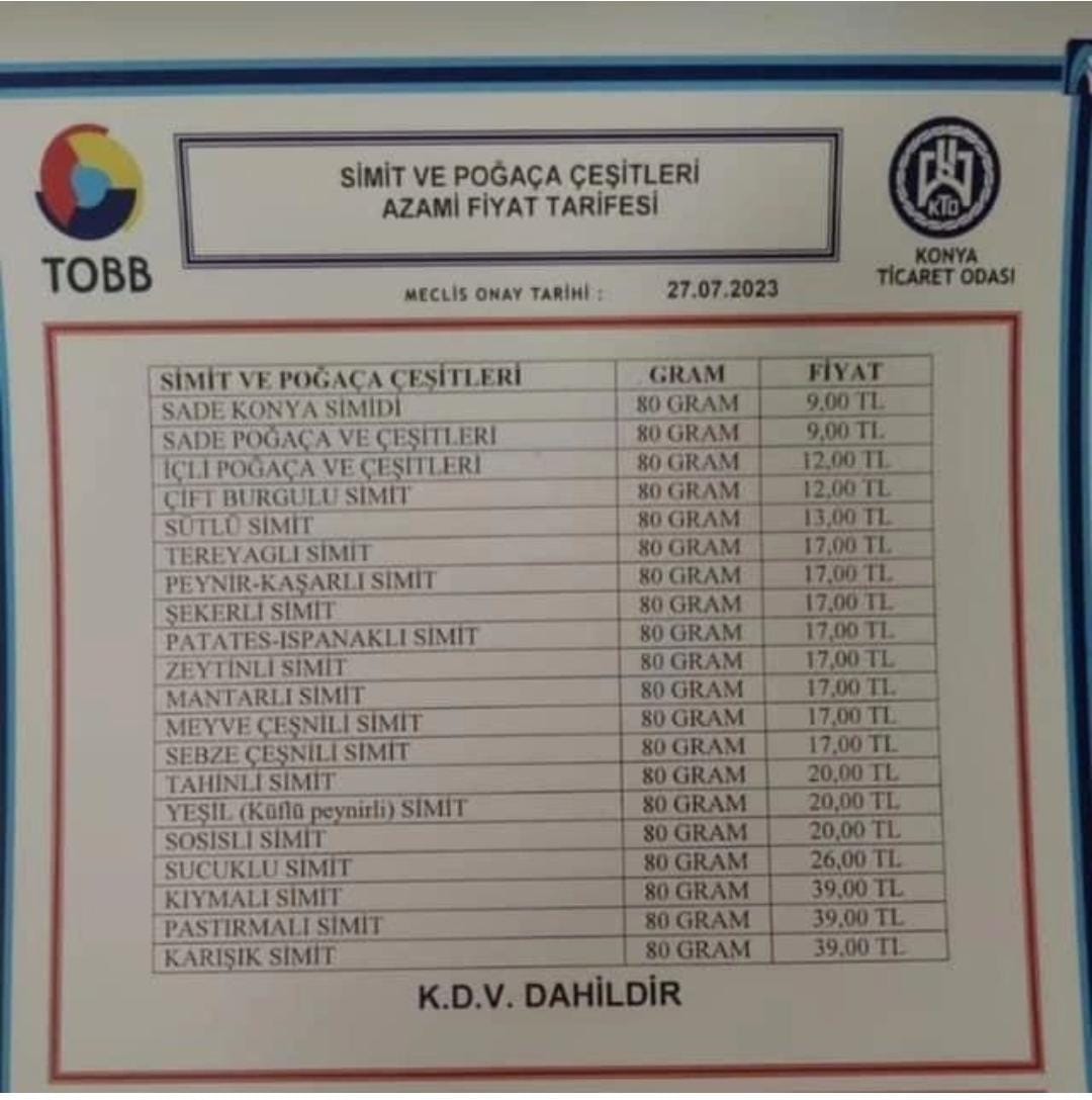 Konya'da  Son gelen zamla birlikte simit ve poğaça fiyatları şu şekilde: