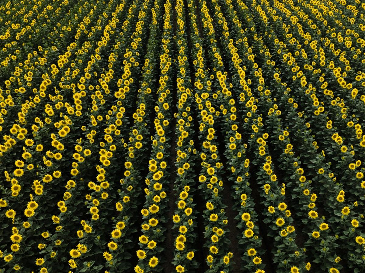 Tarlanın merkezini esas alan, yarı çap uzunluğundaki hareketli robotik sulama sistemine göre ekimin yapıldığı 6 dairesel tarlada açan ayçiçekleri, güzel görüntü oluşturuyor.