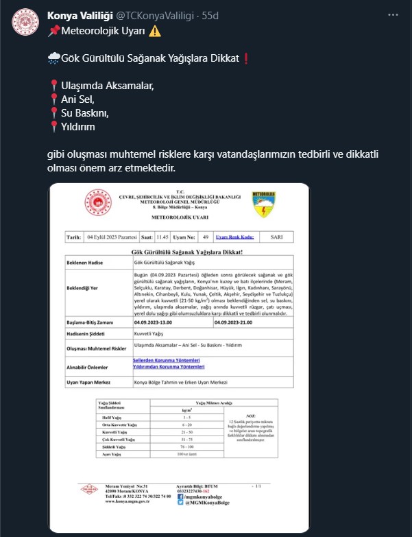 '' Bugün (04.09.2023 Pazartesi) öğleden sonra görülecek sağanak ve gök gürültülü sağanak yağışların Konya'nın kuzey ve batı ilçelerinde (Meram, Selçuklu, Karatay, Derbent, Doğanhisar, Hüyük, Ilgın, Kadınhanı, Sarayönü,Altınekin, Cihanbeyli, Kulu, Yunak, Çeltik, Akşehir, Seydişehir ve Tuzlukçu) yerel olarak kuvvetli olması beklendiğinden sel su baskını Yıldırım ulaşımda aksamalar yağış anında kuvvetli Rüzgar çatı uçması yerel dolu yağışı gibi olumsuzluklara karşı dikkatli ve tedbirli olunmalıdır.''