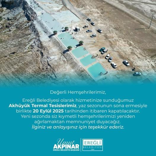 Akhüyük Termal Tesisleri, sağladığı sağlık ve dinlenme imkânlarıyla Ereğli halkı ve ziyaretçiler tarafından yoğun ilgi görüyor. Belediye yetkilileri, tesislerin bakım ve yenileme çalışmalarının tamamlanmasının ardından yeni sezonda yeniden hizmet vermeye başlayacağını açıkladı.