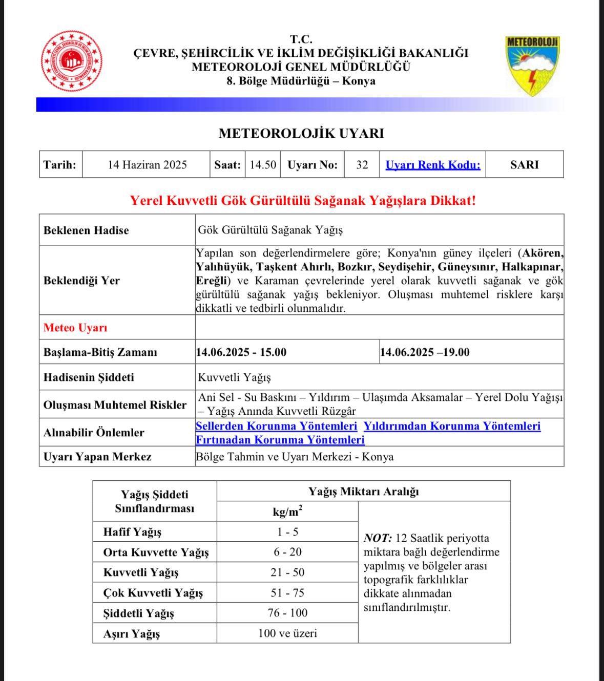Konya Meteoroloji 8. Bölge Müdürlüğü, 14 Haziran 2025 Cumartesi günü için yerel kuvvetli gök gürültülü sağanak yağış uyarısında bulundu. Saat 14.50 itibariyle yayımlanan ve sarı kodla duyurulan meteorolojik uyarıya göre, Konya'nın güney ilçeleri ile Karaman çevresinde 15.00 ile 19.00 saatleri arasında etkili sağanak ve gök gürültülü yağışlar bekleniyor.