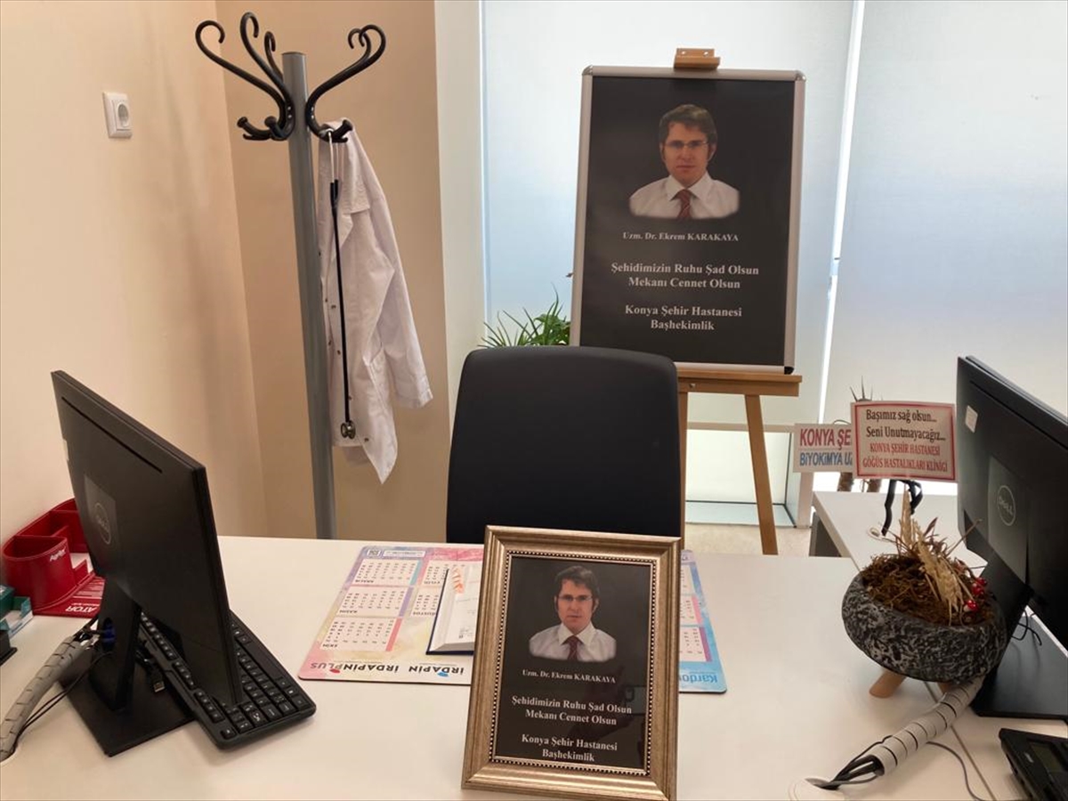 Karakaya'nın mesai arkadaşları, Konya Şehir Hastanesi'ndeki odasının önünde bir araya gelerek, odasına çiçek bıraktı.