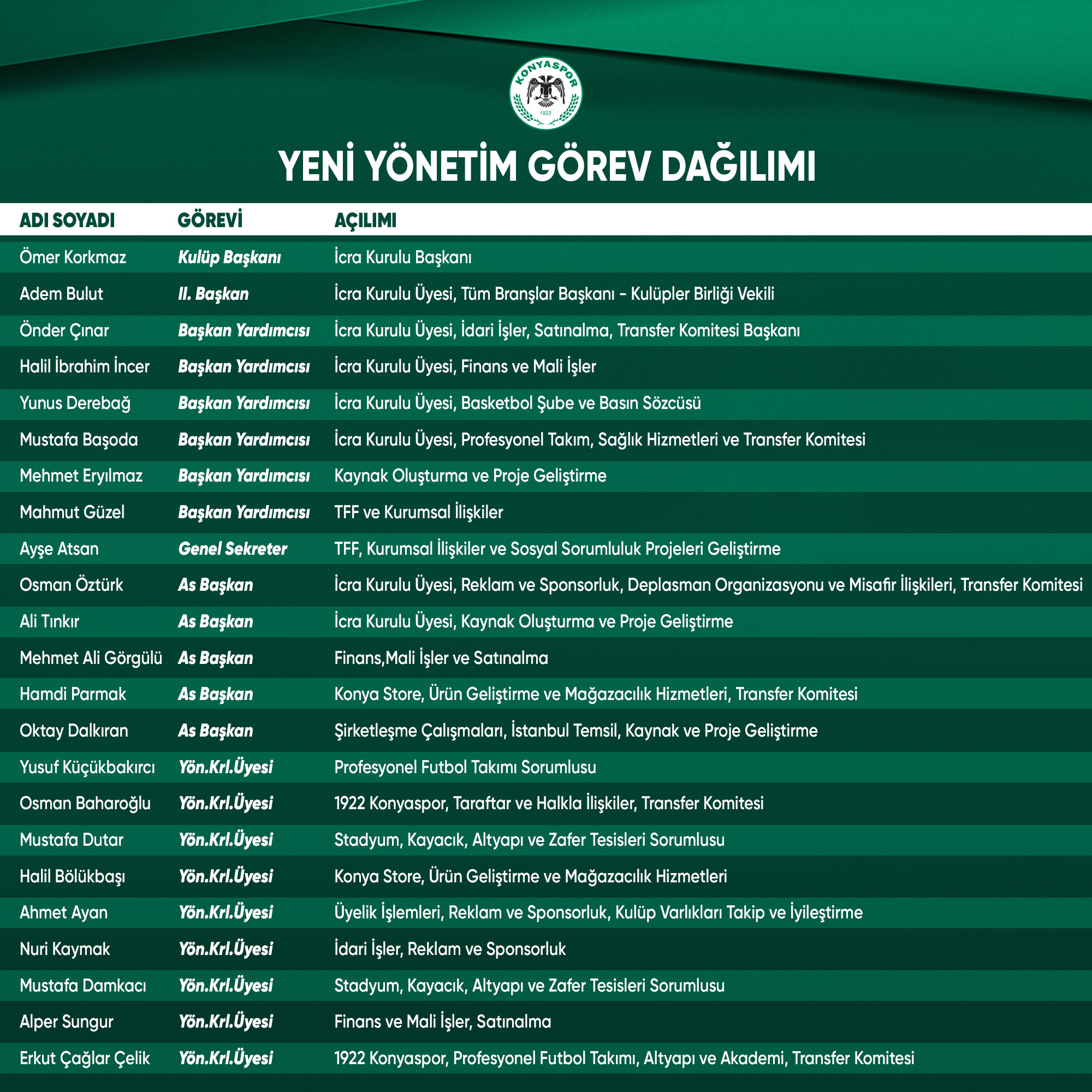 Yeşil-beyazlı kulüpte görev dağılımı şu şekilde oluştu;