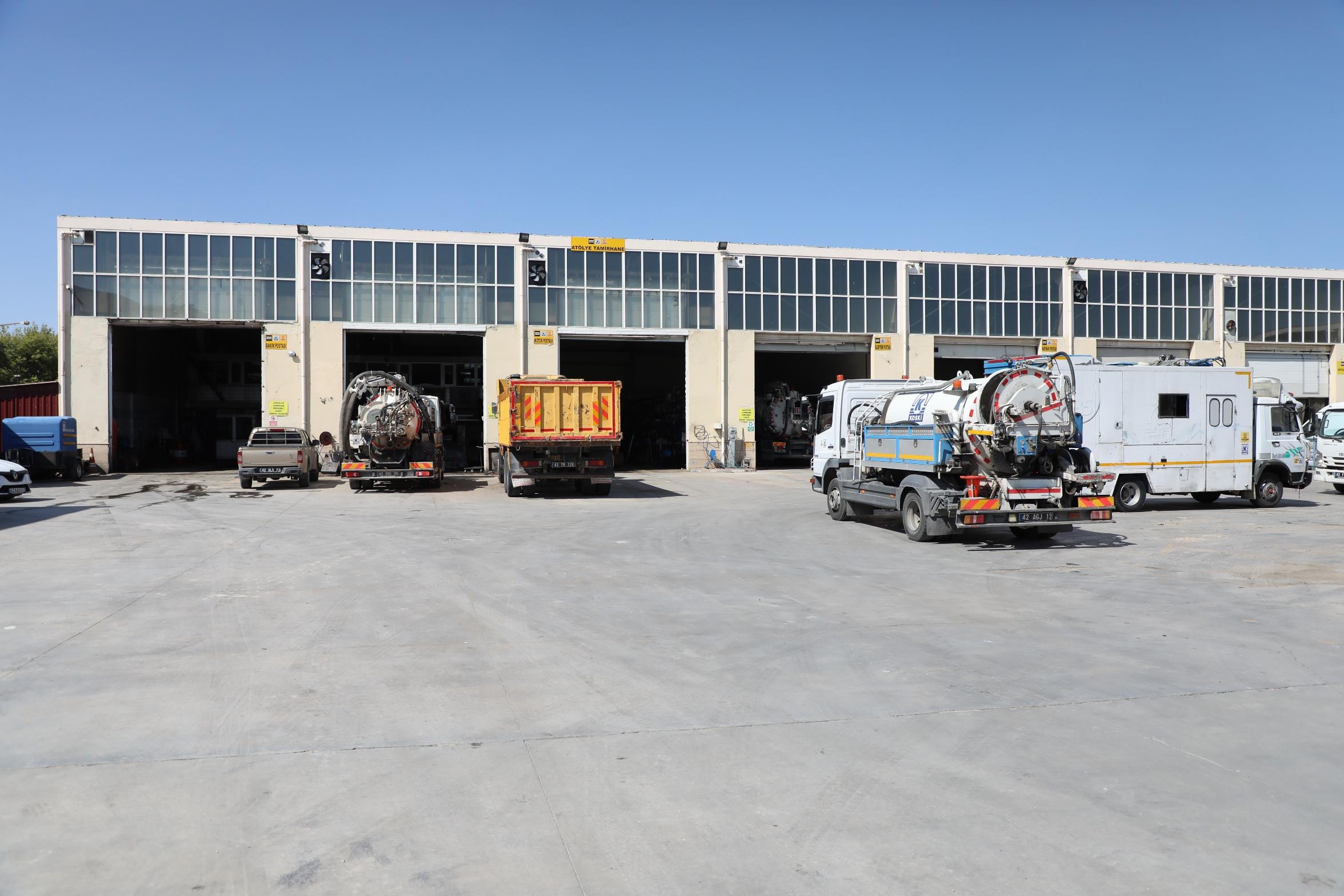 KOSKİ'nin Selçuklu Tesisleri'nde bulunan donanımlı tamirhane atölyelerinde, kurum bünyesinde kullanılan merkezdeki tüm iş makineleri, kamyon, kamyonet ve kombine kanal açma araçlarının bakım ve onarımları tamamen KOSKİ'nin kendi uzman personeli tarafından gerçekleştiriliyor. İlçelerde bulunan araçların tamir ve periyodik bakımları ise sanayi yerel esnafı işbirliğinde yapılıyor. Bu sayede hem yerel sanayi ekonomisine katkı sağlanıyor hem de zamandan ve akaryakıt sarfiyatından büyük ölçüde tasarruf sağlanıyor. Kurum, bu uygulama ile teknik bilgi birikimini içeride tutarak kurumsal kapasitesini de güçlendiriyor.