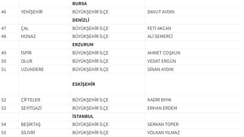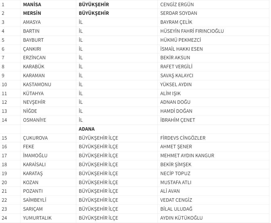 Partimizin yetkili kurullarının yapmış olduğu değerlendirme ve Genel Başkanımız Sayın Devlet BAHÇELİ'nin onayları sonucunda 31 Mart 2024 Mahalli İdareler Seçimlerinde adaylıkları kesinleşen 2 Büyükşehir, 12 il ve 41 Büyükşehir İlçe Belediye Başkan Adayımız olmak üzere toplam 55 adayımızın isim listesi aşağıdadır.