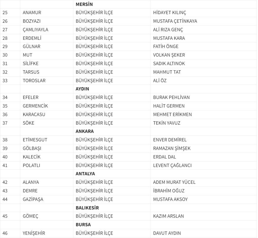 Milliyetçi Hareket Partisi Genel Başkan Yardımcısı Sadir Durmaz duyurdu: " Partimizin yetkili kurullarının yapmış olduğu değerlendirme ve Genel Başkanımız Sayın Devlet Bahçeli'nin onayları sonucunda 31 Mart 2024 Mahalli İdareler Seçimlerinde adaylıkları kesinleşen 2 Büyükşehir, 12 il ve 41 Büyükşehir İlçe Belediye Başkan Adayımız olmak üzere toplam 55 adayımızın isim listesi aşağıdadır." dedi.