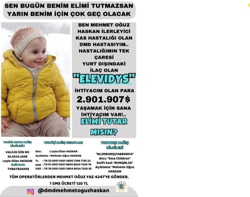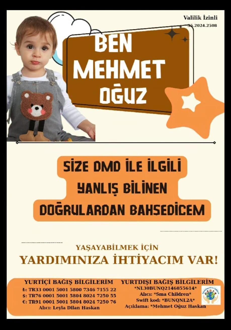 Konya'nın Seydişehir ilçesinde yaşayan 2 yaşındaki Mehmet Oğuz Haskan, ölümcül ve ilerleyici bir kas hastalığı olan Duchenne Musküler Distrofi (DMD) ile hayata tutunmaya çalışıyor. Minik bedeninde koca bir yaşam mücadelesi taşıyan Mehmet için ailesi, Konya Valiliği onaylı yardım kampanyası başlatarak tüm Türkiye'ye yürekten bir çağrıda bulunuyor: