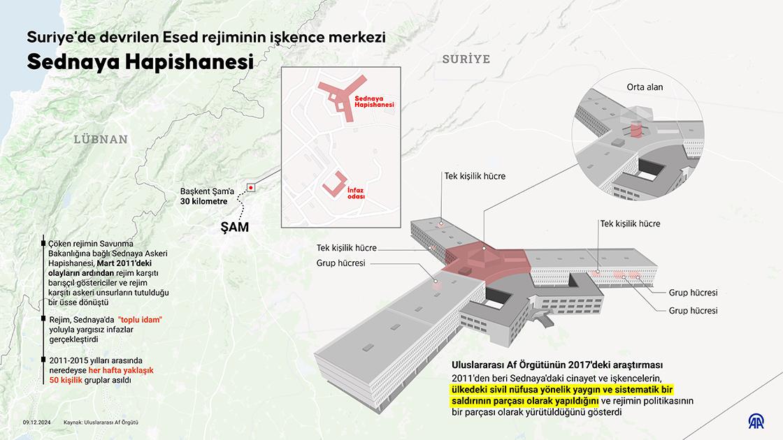 Uluslararası kuruluşların yayımladığı raporlara göre, başkent Şam'a 30 kilometre uzaklıkta bulunan ve çöken rejimin Savunma Bakanlığına bağlı Sednaya Askeri Hapishanesinin Mart 2011'deki olayların ardından rejim karşıtı barışçıl göstericiler ve rejim karşıtı askeri unsurların tutulduğu üsse dönüştüğü belirtiliyor.