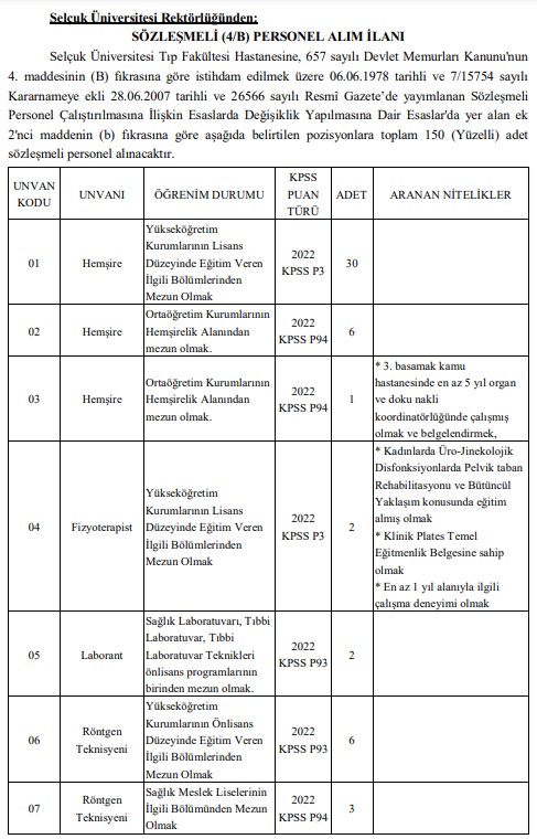 II. ONLİNE BAŞVURUDA SİSTEME YÜKLENMESİ GEREKEN BELGELER: 1. Fotoğraf başvuru sırasında ilgili alana yüklenecektir.(Son 6 ay içerisinde çekilmiş vesikalık fotoğraf sisteme yüklenecektir. ) 2. Nüfus Cüzdanının önlü-arkalı fotokopisi. 3. Ortaöğretim mezunları için önlü-arkalı diploma fotokopisi, Yükseköğrenim (önlisans ve lisans) mezunları için e-Devlet'ten alınacak BARKODLU mezuniyet belgesi. 4. Son 15 gün içinde e-Devlet sisteminden "Devlet Memuriyeti” için "Selçuk Üniversitesi Rektörlüğü” adına alınmış Adli Sicil Kaydı ve Adli Arşiv Kaydı olup olmadığını gösteren BARKODLU belge. 5. Ortaöğretim, Önlisans ve Lisans mezunları için BARKODLU 2022 KPSS (B) sonuç belgesi. 6. Aranan nitelikleri kanıtlayıcı belgeler.(Aranan nitelikleri kanıtlayıcı belge istenen unvanlarda her nitelik için ayrı ayrı belgelendirme yapılarak ilgili alana yüklenecektir.) 7. Deneyim ve hizmet şartı olan unvan kodlarında SGK Tescil ve Hizmet Dökümü (BARKODLU) veya 657 sayılı Devlet Memurları Kanunu'na tabi olarak çalışanlar için onaylı hizmet cetveli 8. Erkek adaylar için son 15 gün içinde e-Devlet sisteminden alınmış BARKODLU askerlik durum belgesi, 9. Son 1 (bir) yıl içerisinde 4/B'li (sözleşmeli) personel pozisyonunda çalışmış olanlar için, daha önce 4/B'li (sözleşmeli) personel pozisyonunda çalıştığı kurumdan alınacak 1 (bir) yıl bekleme süresine tabi olmadığını gösteren belge ve e-devlet sisteminden alınmış BARKODLU SGK Hizmet Dökümü. Not: 6/6/1978 tarihli ve 7/15754 sayılı Sözleşmeli Personel Çalıştırılmasına İlişkin Esasların "Ek madde 7” maddesi gereğince: (Karar Sayısı: Ek: 12/3/2012-2012/2964) Başvuru yapanların Türkiye Cumhuriyeti kimlik numarası, adres bildirimi ve askerlik durumlarına ilişkin yazılı beyanları esas alınacaktır.Gerçeğe aykırı belge verenler ya da beyanda bulunanlar ile ilanımızda belirtilen şartları taşımadığı sonradan tespit edilenler hakkında yasal işlem yapılacağı, atamaları yapılmış ise atamaları iptal edileceği, idare tarafından kendilerine bir bedel ödenmiş ise bu bedel yasal faizi ile birlikte tazmin edileceği hususu önemle duyurulur.