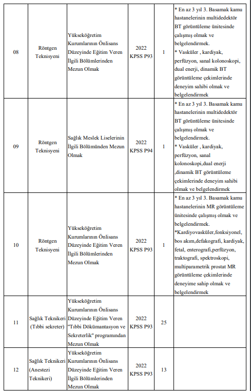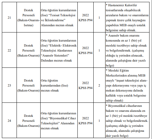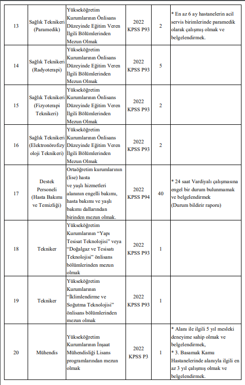 I. ÖZEL ŞARTLAR: 1. Belirtilen öğrenim düzeylerinin birinden mezun olmak, aranan nitelikleri taşımak ve belgelendirmek. 2. Ortaöğretim, Önlisans ve Lisans mezunlarının 2022 KPSS (B) sınavına girmiş olması. 3. Herhangi bir sosyal güvenlik kurumundan emeklilik veya yaşlılık aylığı almıyor olmak. 4. Sadece bir unvan kodu için başvurulacaktır. Birden fazla unvan kodu için başvuru yapılması halinde tüm başvuruları geçersiz sayılacak ve değerlendirmeye alınmayacaktır. 5. Hastanemiz hasta bakımı ve temizliği hizmetlerinde çalıştırılmak üzere; Hasta Bakımı ve Temizliği görevini devamlı yapmasına engel olabilecek hastalık ve benzeri engelleri bulunmamak.