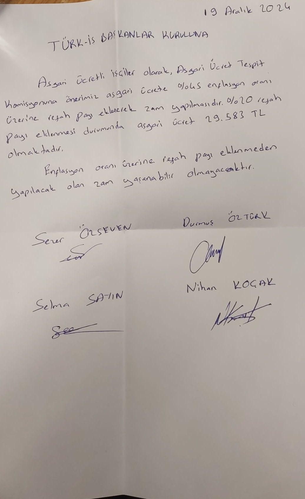 İşçilerin Türk-İş'e verdiği dilekçe ortaya çıktı! İşçiler asgari ücretin refah payıyla birlikte 29 bin 583 Türk Lirası olmasını istedi. Dilekçe Türk-İş'e teslim edildi. Gözler şimdi Asgari Ücret Tespit Komisyonu'nun vereceği kararda.