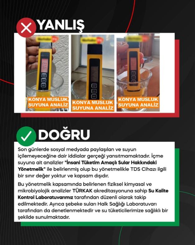 Demir, "Konya'nın içme suyu güvenli şekilde denetlenmekte ve sürekli kontrol altında tutulmaktadır. Vatandaşlarımız yalnızca resmi kurumların yaptığı açıklamalara itibar etmeli”