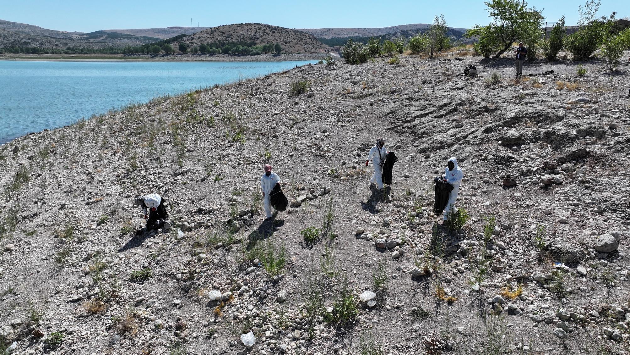 Konya Büyükşehir Belediyesi KOSKİ Genel Müdürlüğü, kuraklıkla birlikte çekilme Altınapa Baraj Gölü’nün etrafındaki çöpleri temizledi.