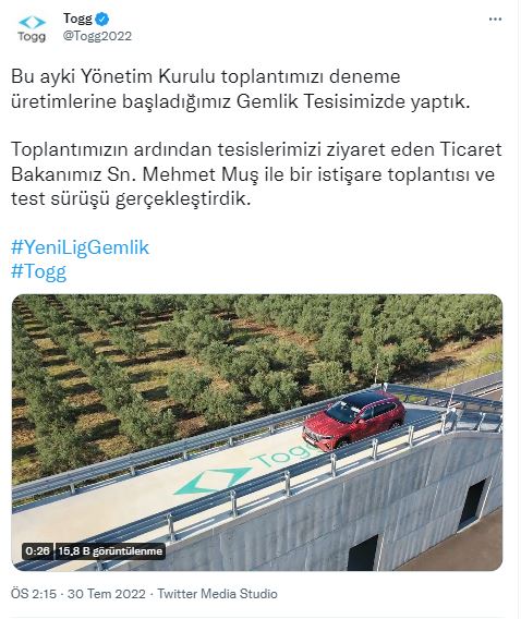 Cumhurbaşkanı Recep Tayyip Erdoğan, TRT ortak yayınında açıklamalarda bulunmuştu. TOGG ile ilgili soruyu da yanıtlayan Erdoğan, "Hedefimiz bu yıl içerisinde çıkartıp keyfini beraberce inşallah tatmak. Bursa Gemlik'te yer alacak fabrika inşaatı Temmuz 2020‘de başlamıştı. Boya, gövde tesisi ile 1.6 kilometre test pisti tamamlandı. Montaj tesisinin yüzde 98'i tamamlandı. Avrupa'nın en temiz boyahane tesisinde kimyasal dolum aşamasına geçildi. Tesisler bu yılın son çeyreğinde seri üretime hazır hale gelecek. İlk seri üretim araçlar bu yılın son çeyreğinde banttan inecek. Batarya konusunda üretimi Türkiye'de yapılacak. Çalışmalar devam ediyor" diye konuşmuştu.
