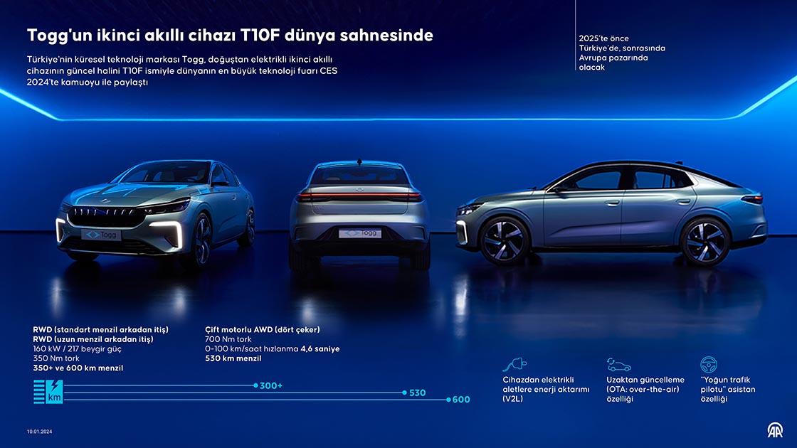TOGG'un Las Vegas'ta tanıttığı T10F modeli, tasarımı ve Türkiye'de en uzun menzile sahip elektrikli otomobillerden biri olmasıyla öne çıkmasının yanı sıra bir güç kaynağı olarak kullanılması, yapay zeka sistemleri ve sürüş destek asistanları gibi özellikleriyle de dikkati çekiyor.