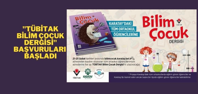 Karatay'da eğitim gören ortaokul öğrencilerinin TÜBİTAK Bilim Çocuk Dergisi'ni alabilmeleri için 25 Şubat Cuma gününe kadar https://bilimcocuk.karatay.bel.tr adresinden kaydını oluşturması gerekiyor. Projeye Karatay'daki tüm ortaokullarda eğitim gören öğrenciler ve Karatay'da ikamet eden ancak başka bir ilçede eğitim gören öğrenciler de katılabilecek.
