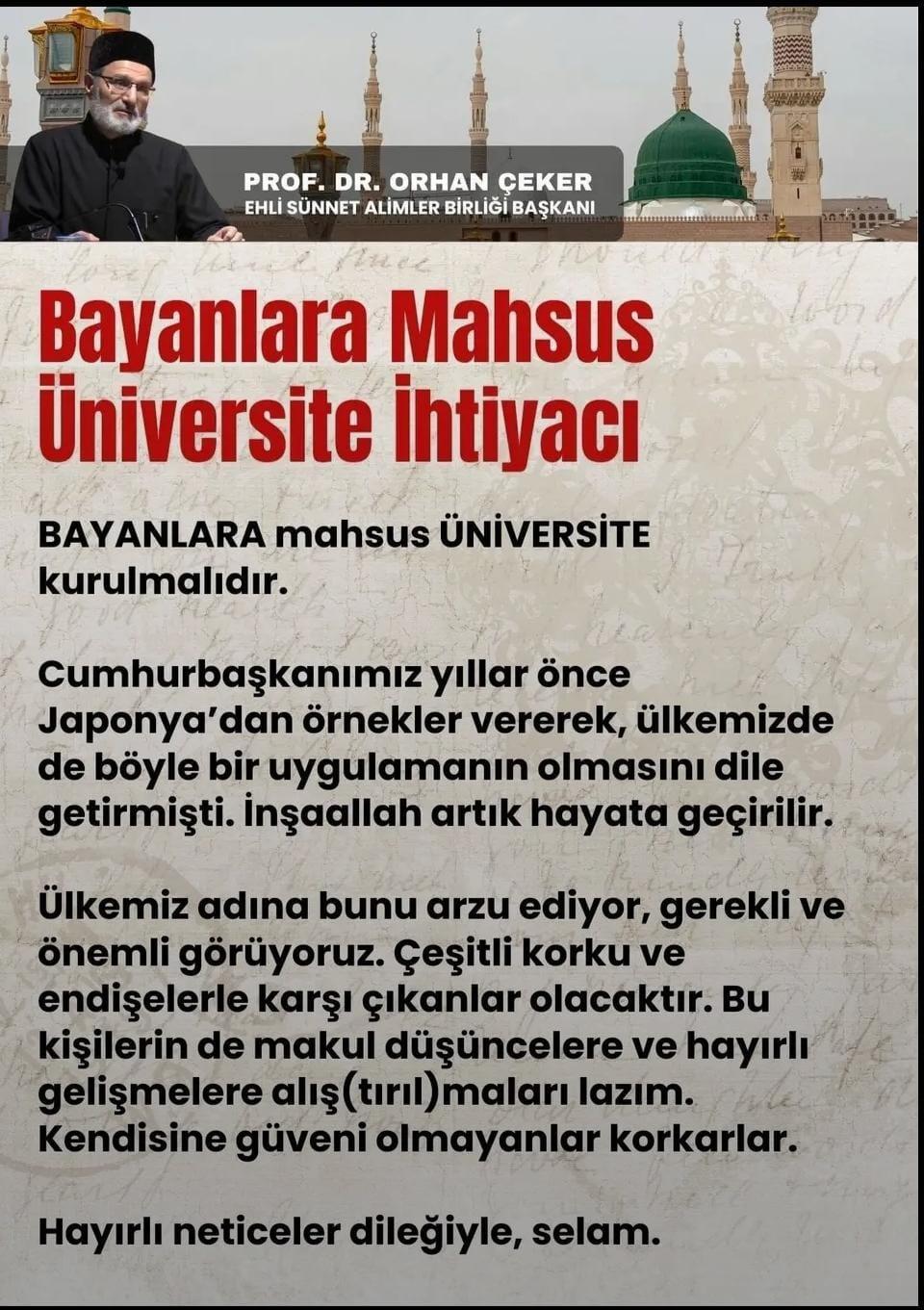 Ehl-i Sünnet Âlimler Birliği Başkanı Prof. Dr. Orhan Çeker, Türkiye’de kadınlara mahsus bir üniversitenin kurulması gerektiğini belirterek dikkat çeken bir çağrıda bulundu.