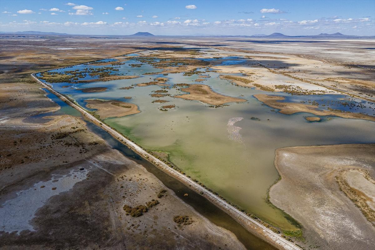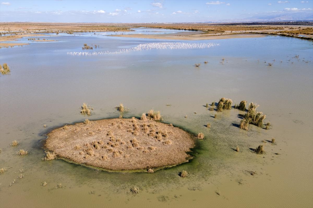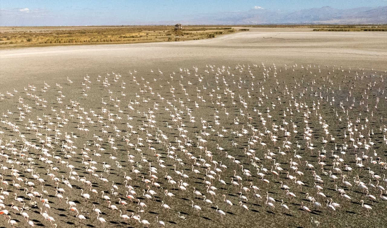 Kurumanın eşiğinde olan Akgöl sulak alanında, göç yolundaki flamingolar çatlamış topraklar üzerinde görüntülendi.